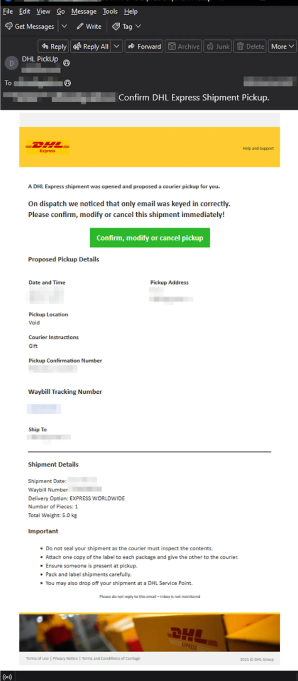 • Unprofessional layout and missing shipment details - The email design is sloppy, and key information like a real pickup address and customer account number is missing — not what you'd expect from DHL or NZ Post.