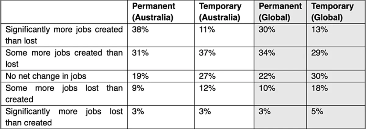 Business leaders in Australia and globally were asked 'How will new technologies affect the net number of jobs across your team in 2020?'