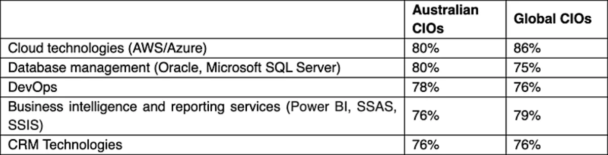 Business leaders in Australia and globally were asked to indicate tech specialisms experiencing high to urgent demand in their IT departments. Here are the top 5 skills.