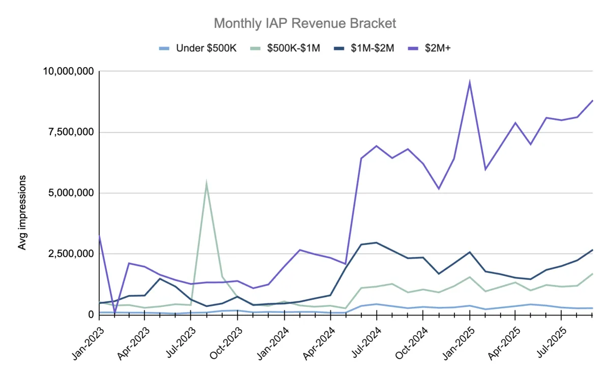 As seen in Figure 3, Higher IAP revenue brackets (>$1M) generally require less creatives per million impressions, suggesting that efficiency improves as creative systems mature. In other words, publishers that produce more creatives are generally more efficient in finding winning creatives that can truly scale.